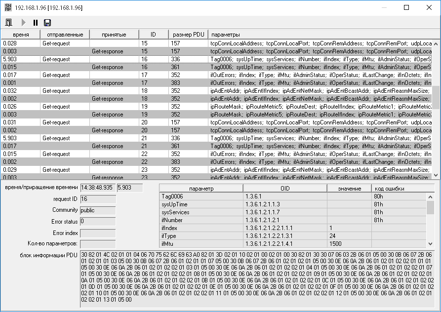 В Программе предусмотрено окно для контроля обмена пакетами с расшифровкой информации: