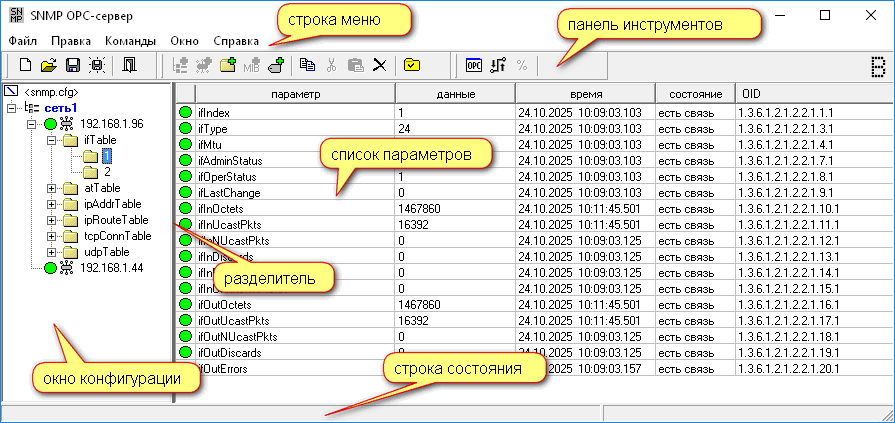 Программа формирует в дереве конфигурации ОРС-сервера для выбранного устройства структуру максимально схожую со структурой MIB. Модули, группы, таблицы и строки представляются в виде элементов типа "группа" с сохранением порядка вложенности. Объекты добавляются в виде параметров т.е. собственно ОРС-тегов