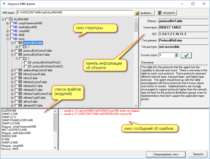 Программа выполняет парсинг MIB-файла и всех зависимых файлов. Имена файлов и наименования модулей отображаются в списке по мере обработки. В окне ошибок выводятся сообщения об ошибках (отсутствие файлов или нарушения синтаксиса). Сформированная структура представяется в окне структуры в виде дерева. Узлами дерева являются:- корневой элемент