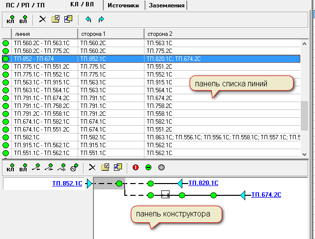 Схема соединений элементов ПС, РП, ТП создаётся при помощи графического редактора, который позволяет оператору контролировать правильность схемы визуально.