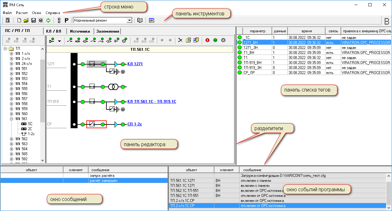 - диагностические сообщения при проведении расчета (подача напряжения на заземленный участок, подача напряжения от двух разных источников)
